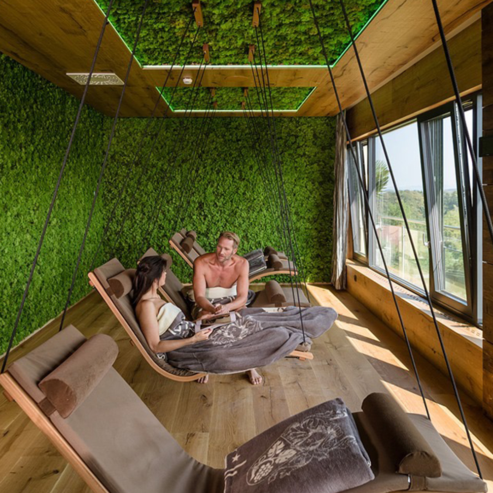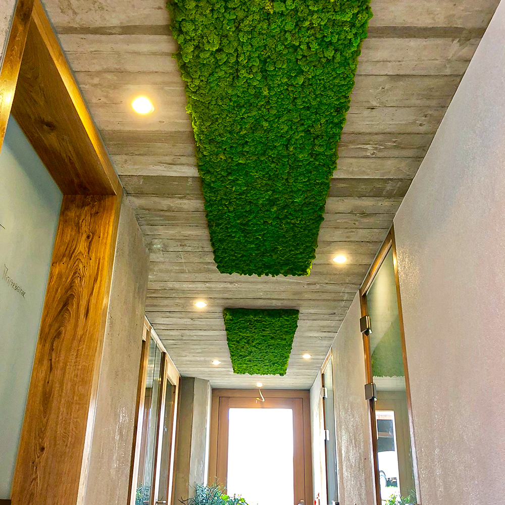 Gestaltungen mit echten natürlichen Materialien in Lebensräumen ermöglichen uns den physischen Kontakt mit der Natur. Laut wissenschaftlichen Studien wirken die natürliche Strahlkraft und Energie des Waldes, die auch dem konservierten Moos noch innewohnen, positiv auf das Wohlbefinden, stärken die Konzentration und bescheren mehr innere Ruhe. Herzschlag und Blutdruck sinken merkbar und nachweislich. Messbar sind auch die schallabsorbierenden Eigenschaften einer Mooswand, welche zur Optimierung der Raumakustik beitragen.